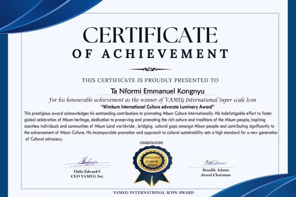 Taa Nformi Emmanuel Kongnyu, a prominent figure in the Mbum community, was honored with the “Wimbum International Culture Advocate Luminary Award” at the 2025 Vanguard Media Group (VAMEG) International Icon Awards on Saturday. The ceremony, held in Bafoussam, recognized his decades-long commitment to preserving and promoting the cultural heritage of the Mbum people.